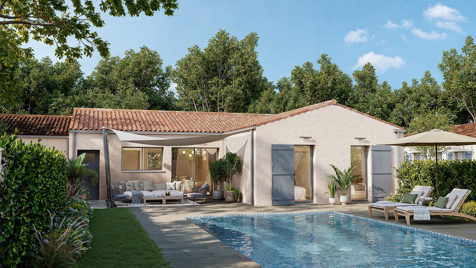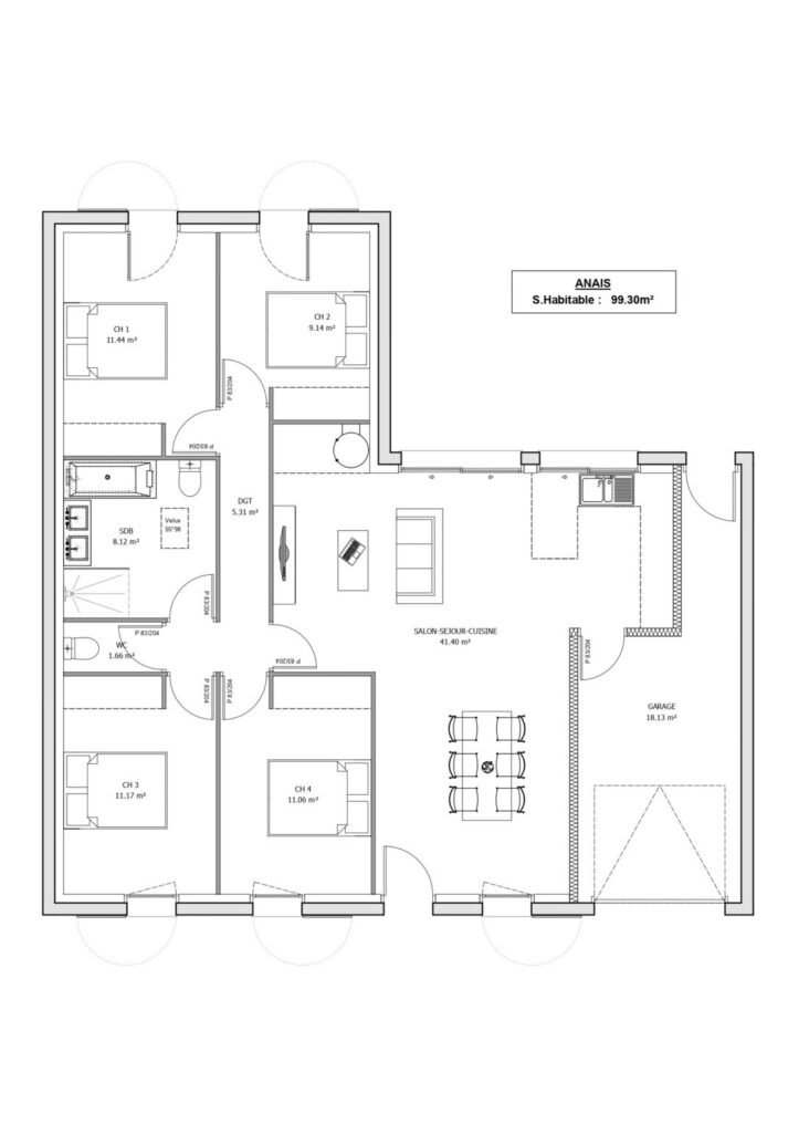 Anaïs est une maison de 4 chambres à moins de 100m² habitables. elle possède 2WC, 1 baignoire et une douche pour le confort de toute la famille. Son garage et son salon séjour traversants lui permettent de s’implanter sur des terrains de faible largeur. Sa forme en L en façade arrière allie esthétisme et fonctionnalité en protégeant la terrasse des différentes nuisances. C’est un modèle optimisé qui ne fait aucune concession pour le plus grand plaisir des investisseurs et familles nombreuses.