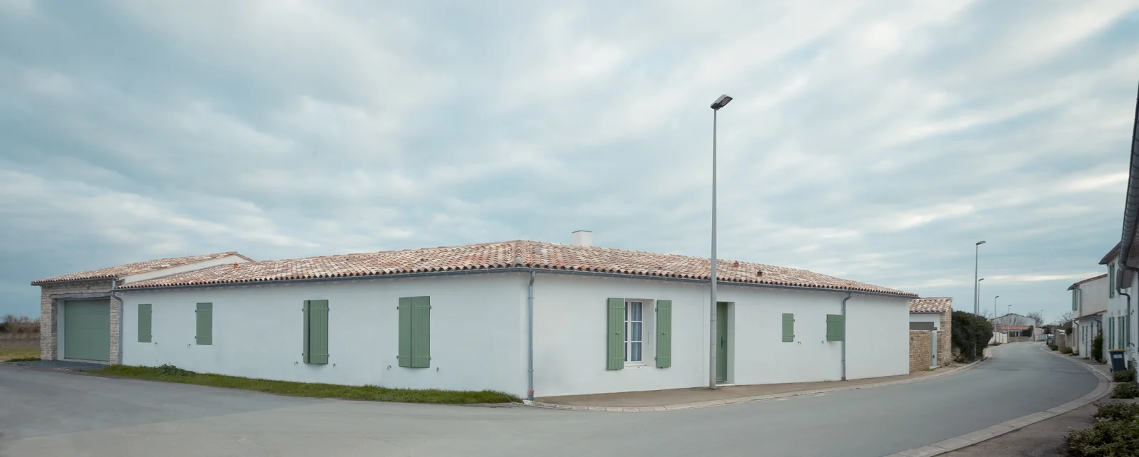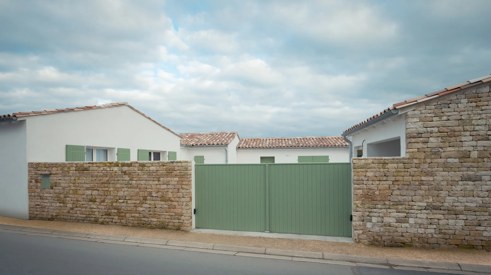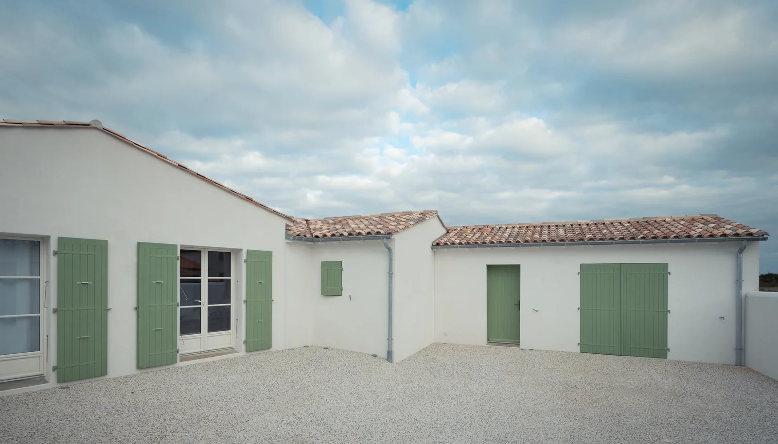 Avec l’évolution des surfaces des terrains ainsi que des règles d’urbanisme, il est très fréquent de devoir construire en limite sur rue. Cette « Rhétaise » en est la parfaite illustration et démontre qu’il est possible de respecter cette contrainte tout en obtenant un excellent rendu. On notera le magnifique rendu des traditionnels mais très techniques murs en moellon ainsi que l’emblématique couleur des volets de l’île, « le vert pâle »!