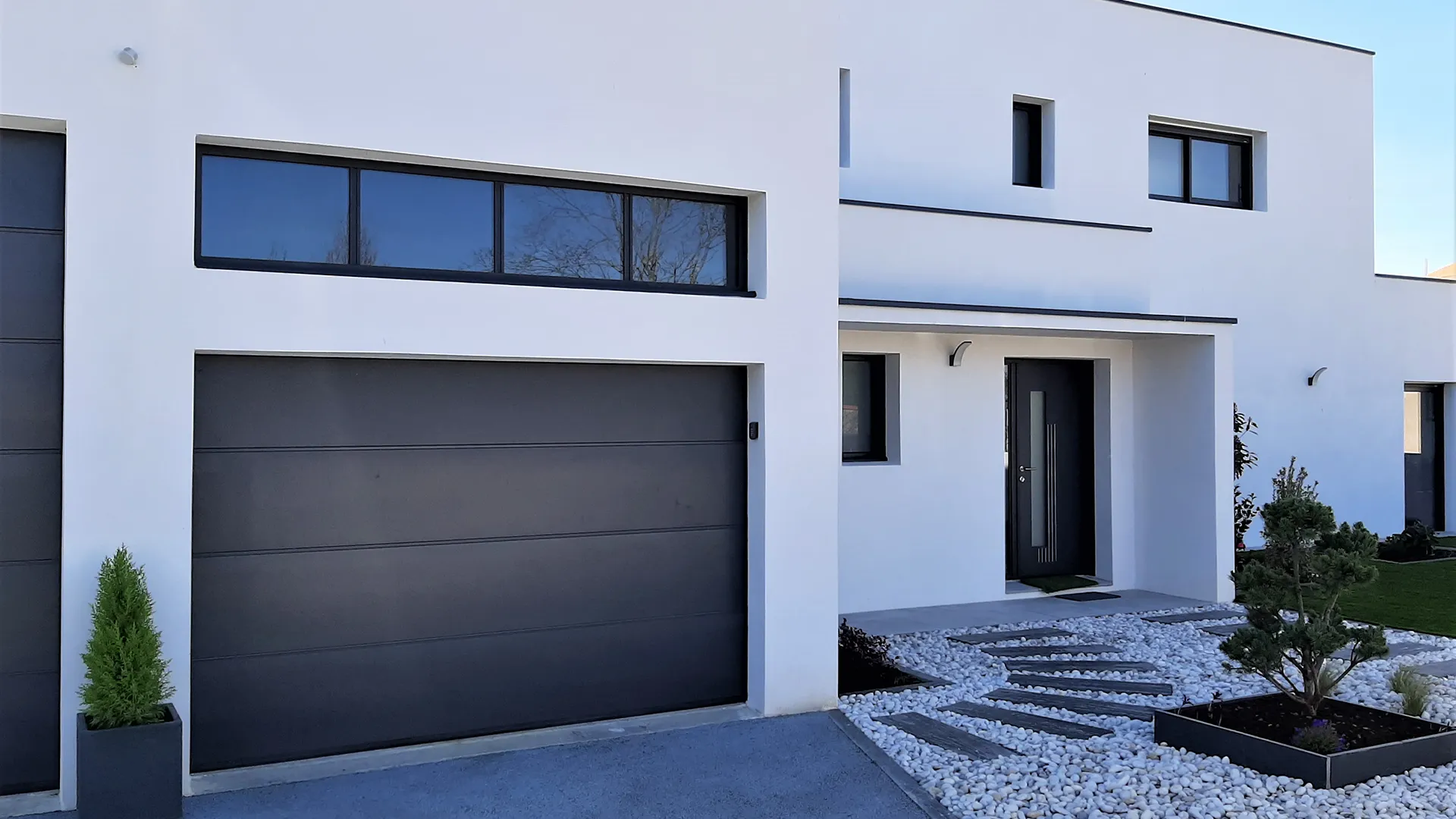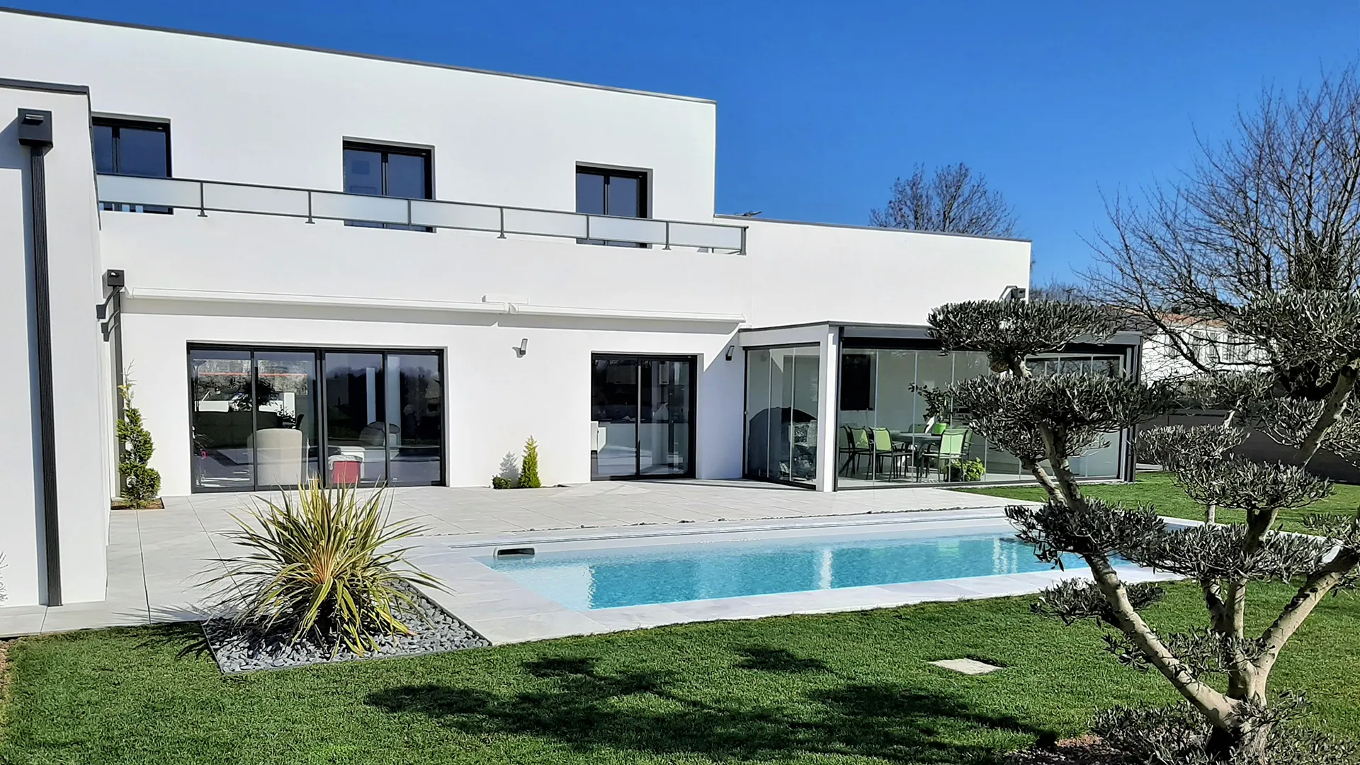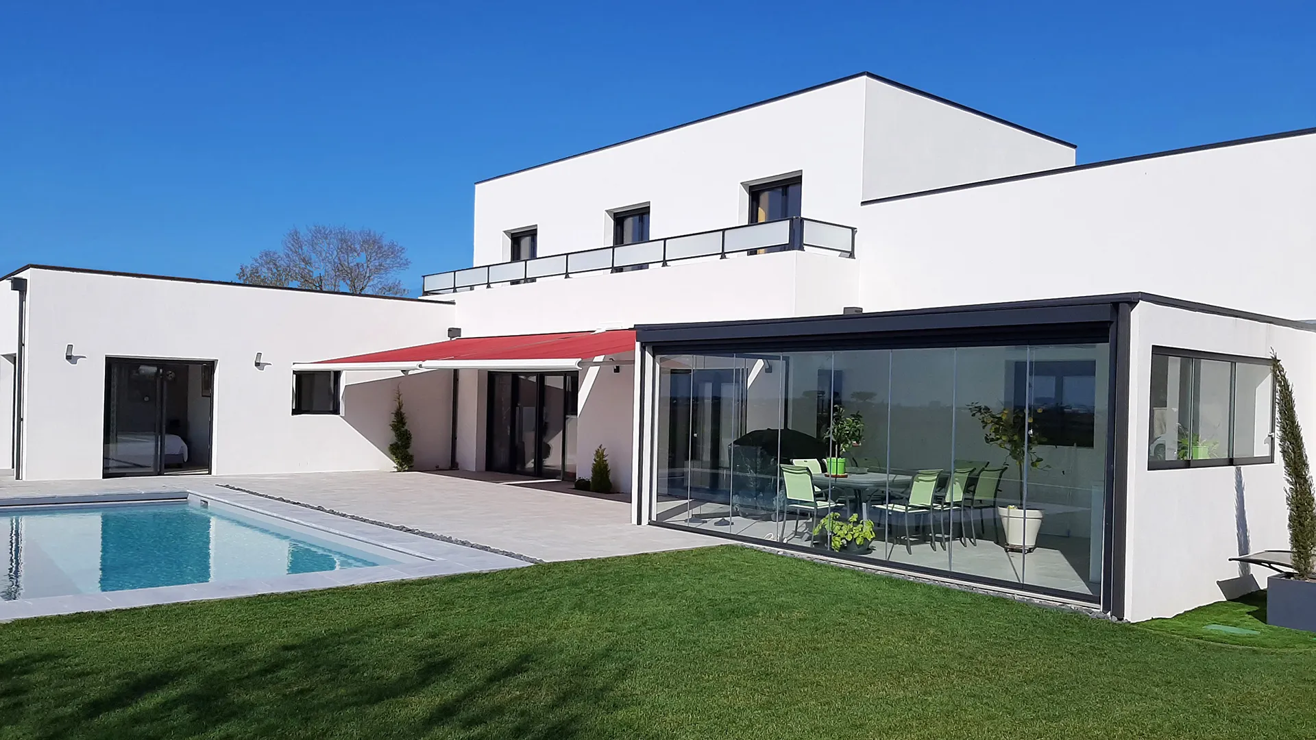 Construction de type contemporaine gràce à son architecture entièrement en toiture terrasse et ses menuiseries gris anthracite qui contrastent avec un enduit taloché blanc. Cette habitation se démarque par son étage, ses volumes rectilignes et maitrisés. Enfin les stores bannes rouge et la terrasse couverte vitrée sont l’originalité qui donne toute sa singularité à cette maison.