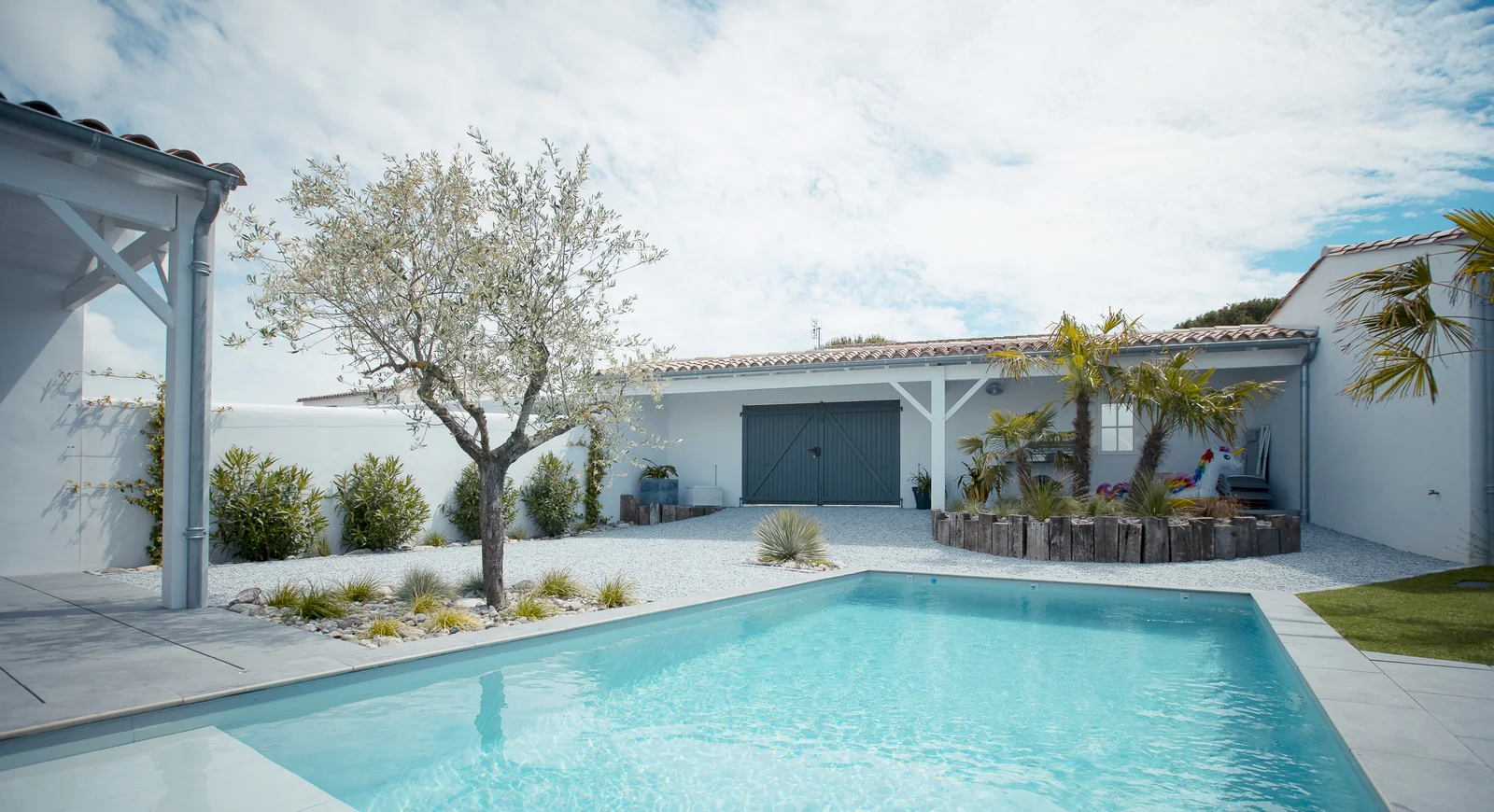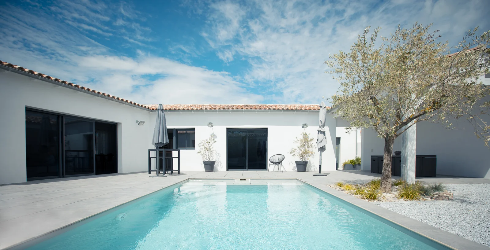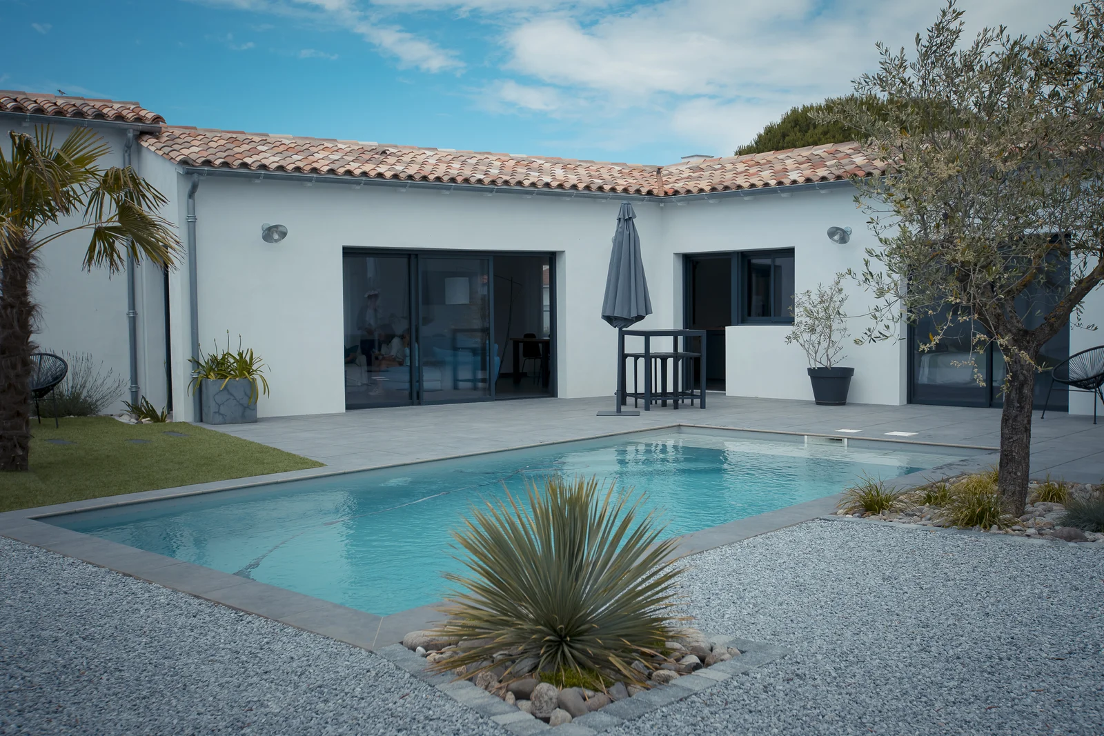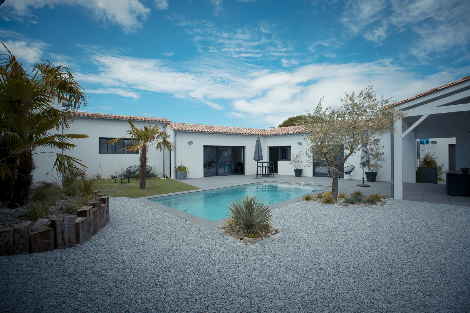 Voici une construction aussi fonctionnelle qu’élégante! En effet ses traits rectilignes sont soulignés par ses menuiseries foncées sur un enduit taloché blanc éclat. Les ouvertures en aluminium étudiées avec soin permettent à la fois un apport de lumière conséquent tout en favorisant l’accès sur l’extérieur et ceci dans un budget contrôlé! L’aménagement extérieur joue également un rôle essentiel pour mettre en valeur cette jolie maison.